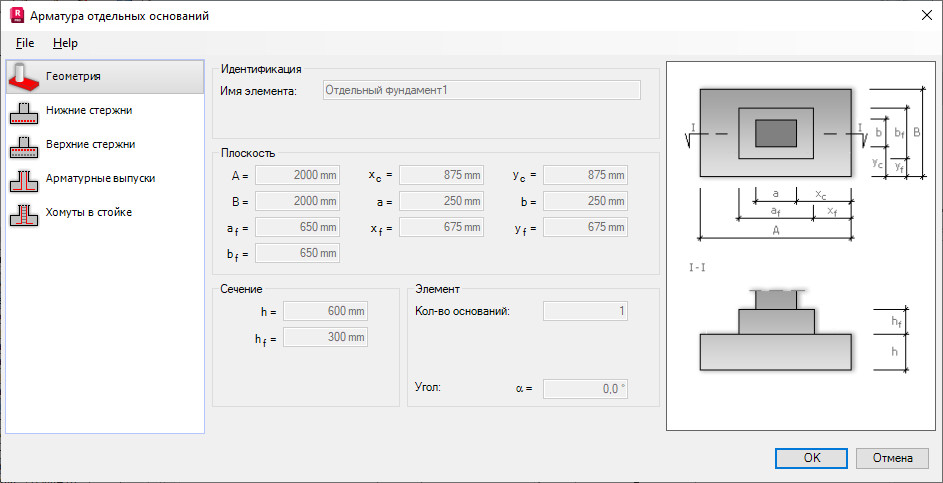 Геометрические характеристики отдельного фундамента:
