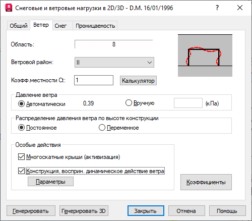 - Многоскатные кровли (активация): позволяет учитывать эффект многократных крыш, т. е. перекрывающих друг друга. Это связано с уменьшением аэродинамических коэффициентов на укрытых элементах.