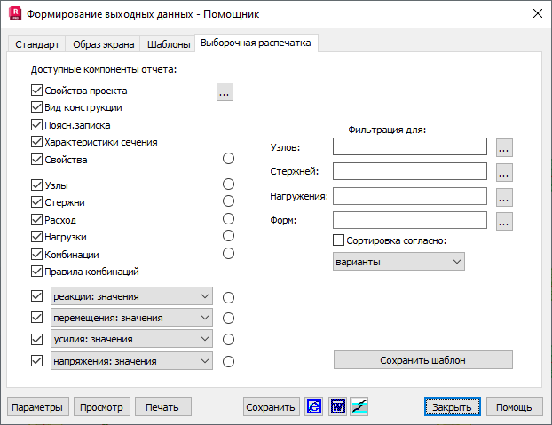 Существуют два пути фильтрации узлов, стержней, вариантов или режимов, для которых должен быть составлен отчет: