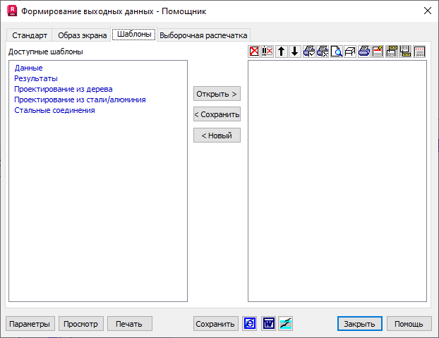Диалоговое окно разделено на две панели: левую и правую. Левая панель содержит шаблоны всех отчетов, имеющихся в программе. Шаблоны содержат виды/чертежи конструкции, соответственно размещенные таблицы данных/результатов. Имеются шаблоны для активизации выбора узла/стержня. Предварительно определенные шаблоны представлены на левой панели голубым цветом. Они не могут быть удалены, хотя пользователь может их переписывать. Если пользователь создаст шаблон и назовет его уже существующим именем (имя изменит цвет на черный – цвет шаблона пользователя), а затем удалит шаблон, имя не будет удалено (цвет изменится на голубой) и предварительно определенное содержание шаблона будет восстановлено.