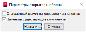 После нажатия на кнопку Открыть, открывается небольшое диалоговое окно, представленное ниже, появляется на экране. Если опция Стандартный шрифт заголовков компонентов не активная (это настройка по умолчанию), шрифт заголовков отдельных компонентов распечатки будет идентичен шрифту открытого шаблона. Если опция активная, заголовки будут представлены шрифтом, определенным пользователем в диалоговом окне Настройки. Если включена опция Заменить существующие компоненты (установка по умолчанию), то элементы с выбранным шаблоном будут печататься, в то время как существовавшие элементы будут удалены. Если эта опция отключена, то элементы с выбранным шаблоном будут добавлены в конец имеющегося вывода на печать.