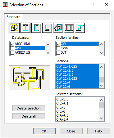Эта функция используется для выбора сечений, применяемых при проверке и проектировании стальных и алюминиевых элементов. Для получения доступа к ней нажмите кнопку "Сечения" в диалоговом окне Определения (вкладка "Группы" для стальных и алюминиевых сечений).