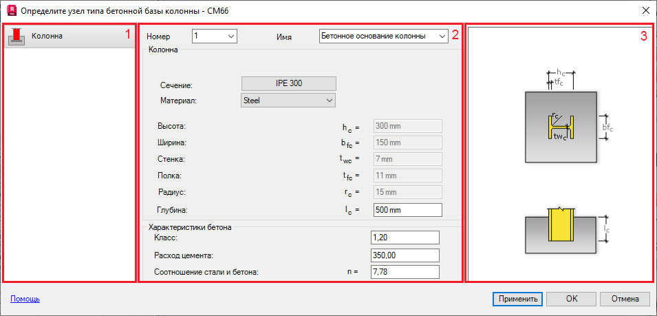 Диалоговое окно для создания соединения "колонна-фундамент" (с основанием бетонной колонны) содержит 3 основные области: