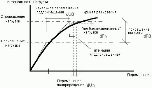 На следующем рисунке показан пример нелинейного процесса с использованием процесса приращения. Здесь показаны величины, используемые для нелинейных расчетов.