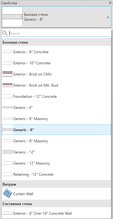 В списке «Выбор типа» отображается выбранный в данный момент типоразмер семейства, и кроме того, в нем можно выбрать другой типоразмер.
