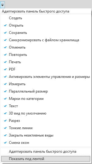 Панель "Быстрый доступ" может отображаться над лентой или под ней. Для изменения настройки отображения на панели "Быстрый доступ" выберите раскрывающийся список "Адаптировать панель быстрого доступа"