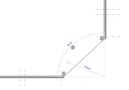 - Укажите конечные точки наружных стен, как показано на изображении, и щелкните третью точку в точке привязки для создания точки дуги под углом 90°.