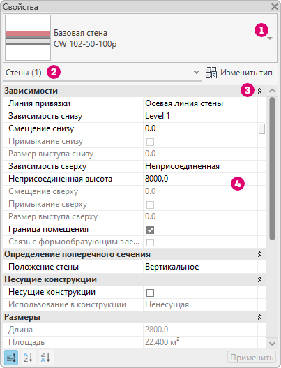 В большинстве случаев (за исключением тех, что упомянуты в следующем примечании) на палитре свойств отображаются и редактируемые пользователем свойства экземпляра, и те, которые доступны только для чтения (они затенены). Свойство может быть предназначено только для чтения из-за того, что его значение является расчетным, или назначается программой автоматически, или зависит от значения другого свойства. Например, для стены единственным редактируемым свойством будет «Неприсоединенная высота», если для ее свойства «Зависимость сверху» задано значение «Неприсоединенная». Определенные взаимосвязи рассматриваются в описаниях свойств экземпляров элементов конкретного типа.