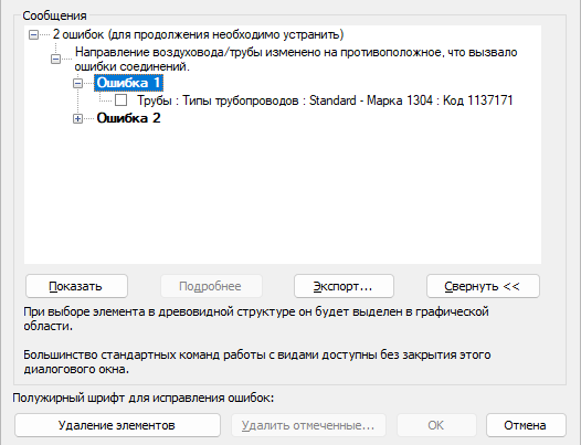 В диалоговом окне ошибки нажмите кнопку "Развернуть" для просмотра древовидной структуры с перечнем ошибок и предупреждений, связанных с последним действием.