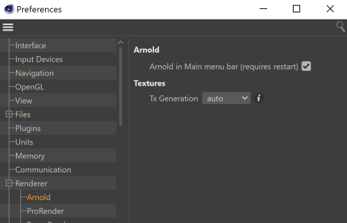 您可以将 Arnold 插件菜单移动到“插件/扩展”(Plugins/Extensions)菜单下的本地位置。转到“编辑 > 首选项... > 渲染器 > Arnold”(Edit > Preferences... > Renderer > Arnold), 然后禁用“主菜单栏中的 Arnold”(Arnold in main menu bar)复选框: