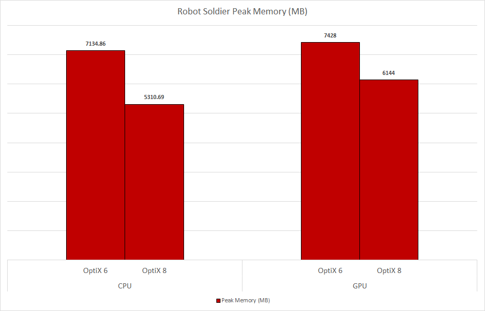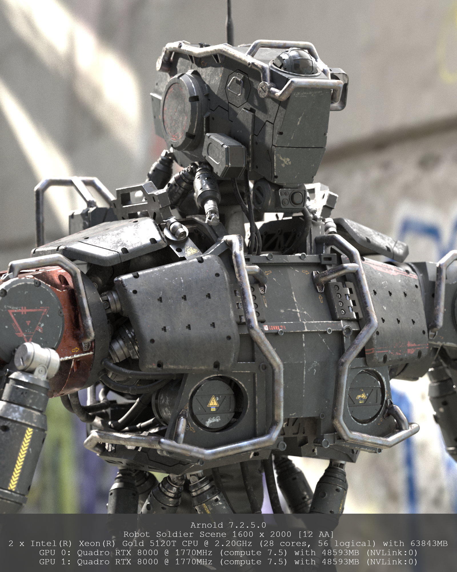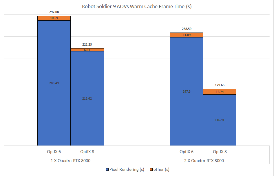 Better multi-GPU scaling: Render time scaling with multiple GPUs has been improved in scenes with many AOVs. When adding a second GPU, the robot soldier scene with 9 AOVs goes from having just a 1.1x speedup in the previous version of Arnold to a 1.7x speedup in Arnold 7.2.5.