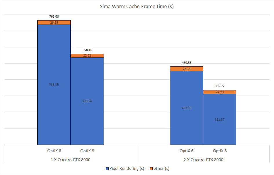 A large part of the GPU renderer was rewritten using NVIDIA OptiX 8. This allowed numerous improvements such as much faster startup times and better scaling on multiple GPUs. Production scenes with large numbers of textures should also be faster to render and use less GPU memory. (ARNOLD-9882)