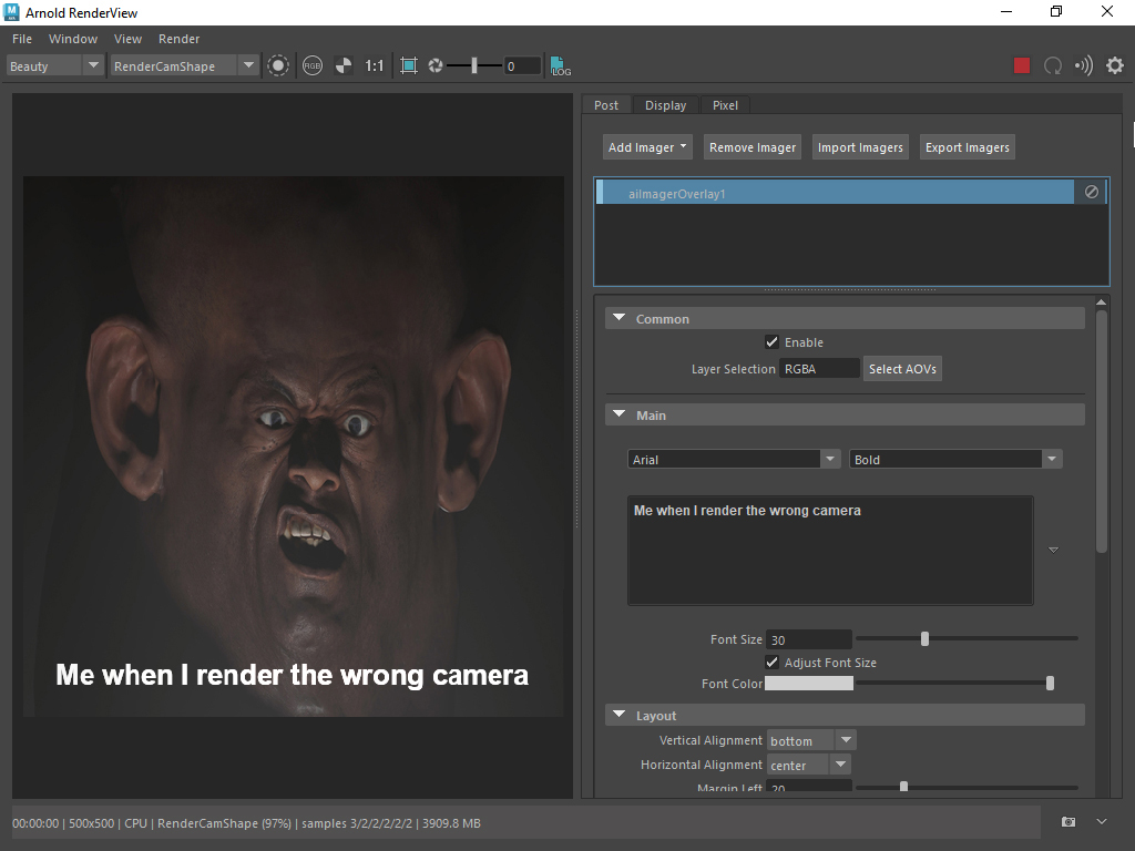 OPENIMAGEIO_FONTS environment variable. You can include scene and system information, and render statistics, with pre-defined tokens, such as <frame_time>, <samples>, and <camera>. See the Overlay Imager documentation for the full list of tokens. (ARNOLD-14188)