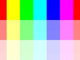 | 色调和饱和度的 1:1 映射。灯光外观的物理表示。 | 1:1 映射的量化版本,使用 18 个不同的单元,具有不同的饱和度级别。 | 在红色和蓝色色调之间具有清晰过渡的放大版本。 |
