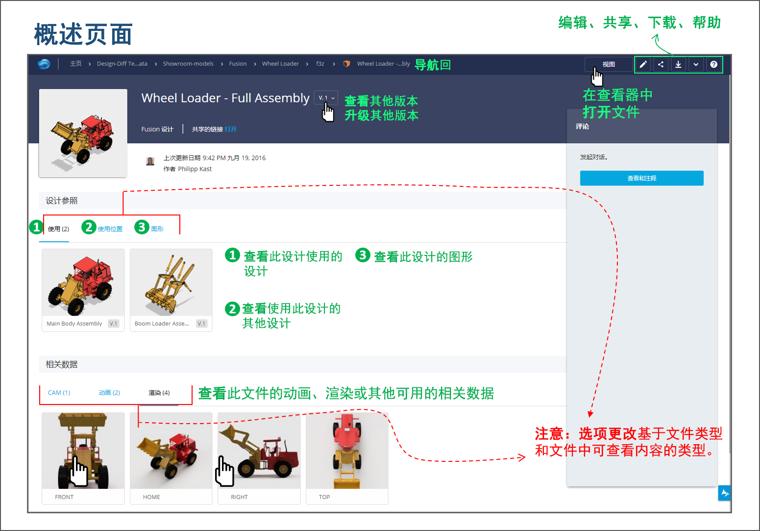 要查看文件的详细信息,请在 A360 查看器中单击“查看概述”。下图将定向到“概述”页面的布局。绿色文字可调出您可以在该页面上执行的操作。