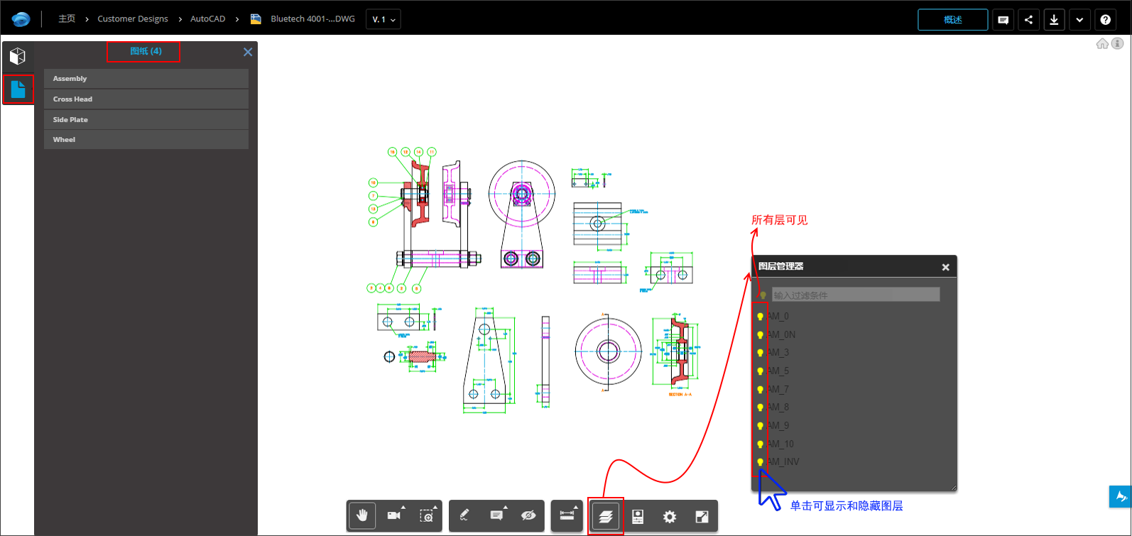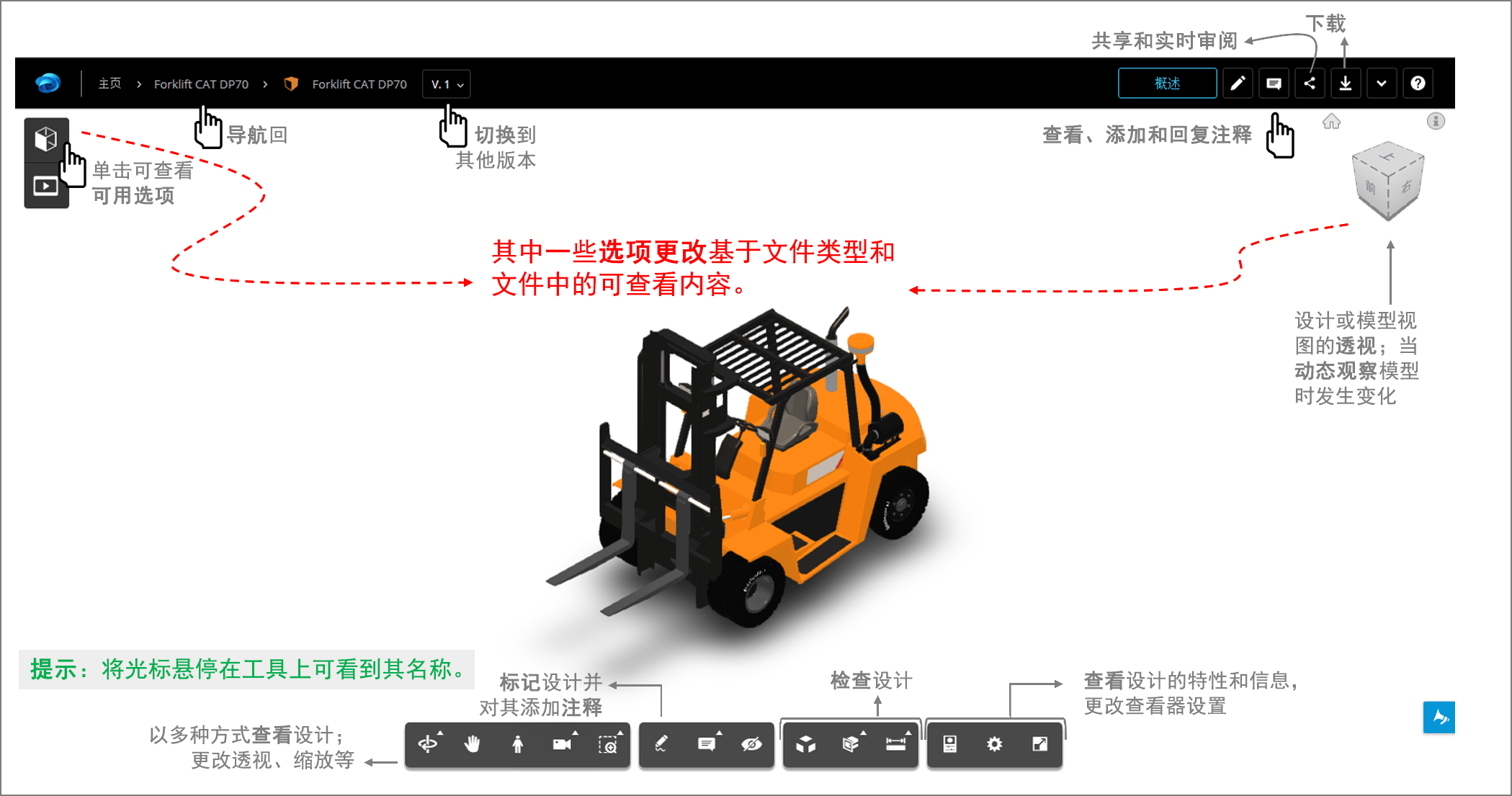 在文件夹内单击设计文件以在 A360 查看器中将其打开。也可以单击“概述”页面中的“视图”以在查看器中打开文件。下面的屏幕截图显示查看器的主要区域和您拥有的选项。要查看您在 Revit 文件和 DWG 文件中拥有的选项,请参见以下部分。单击此处了解有关查看 Fusion 设计的信息。
