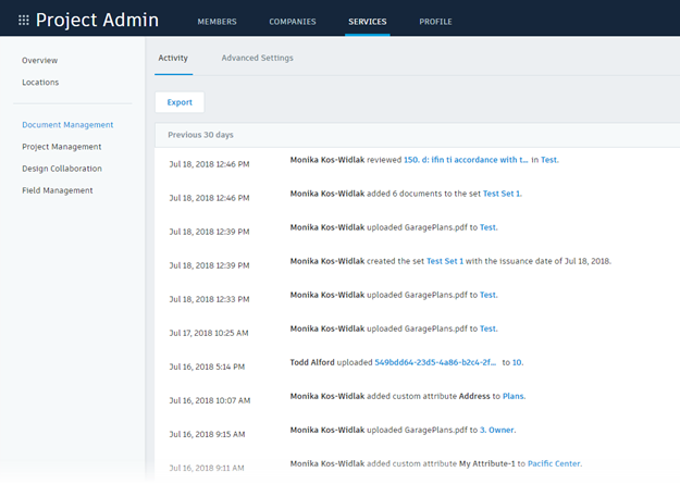 如果对使用 Document Management 模块的项目做出任何更改,将在“活动”日志中记录这些更改。您可以基于所选的日期范围查看活动,并将日志导出为 Excel 电子表格。