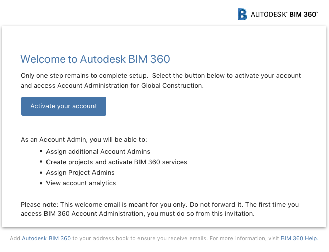 如果您是第一个帐户管理员,您将收到来自 Autodesk 的欢迎电子邮件,其中包含一个指向激活您的帐户的链接。此激活电子邮件是您与产品之间的第一个接触点。