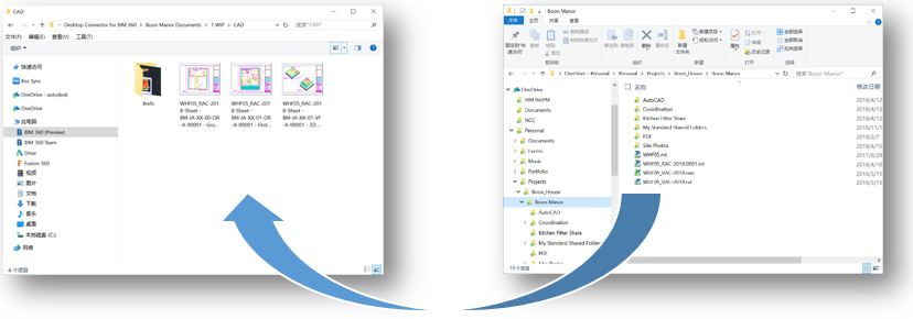 - 将步骤 2 的所选项拖放到步骤 4 的目标位置,即可从 BIM 360 下载文件。