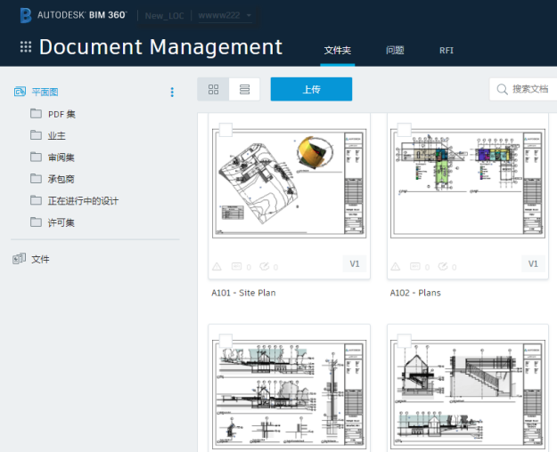 每个 BIM 360 项目在开始时都会有预配置的工作空间,用来支持特定的处理或数据类型。这些顶层工作空间是“平面图”文件夹和“项目文件”文件夹。