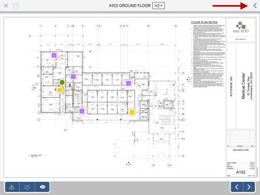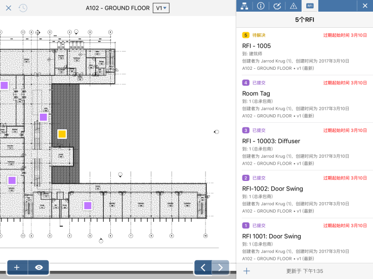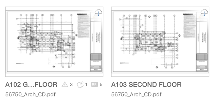 - 在缩略图视图中,单击包含 RFI 的文档。在此示例中,“A102 Ground Floor”图纸包含五个附加 RFI,由 RFI 图标和编号表示。
