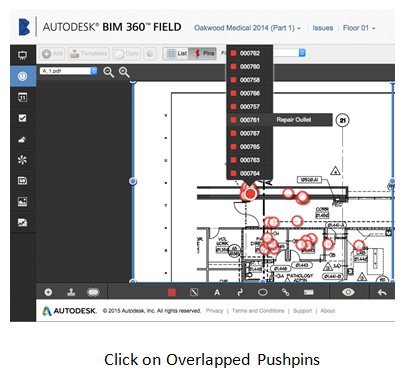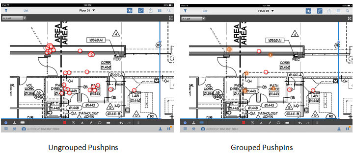 最新版本的 BIM 360 Field 改进了在一个文档中处理大量图钉问题时的用户体验。现在处理重叠图钉时可以轻松编组图钉。