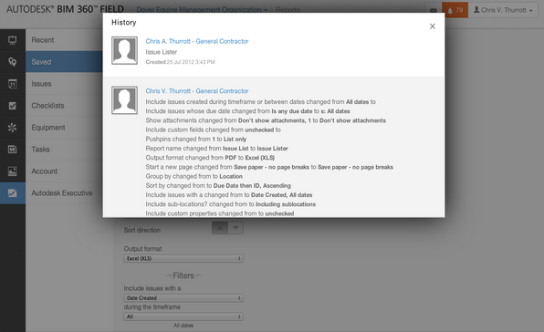 现在可以看到已计划和保存报告的更改历史记录。您可以看到每次更改前和更改后的值,以及更改时间及执行更改的人员。单击报告说明下方的“历史记录”按钮以打开“历史记录”窗口。