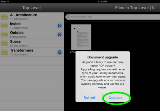 若要使用这些功能,您需要升级库文档。首次在 iPad 上同步每个项目时,会看到以下消息。点击“更新”按钮以更新文档。这是个一次性操作(每个项目)。