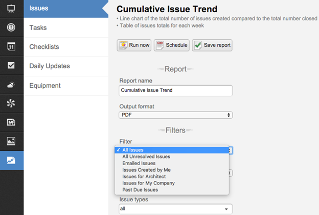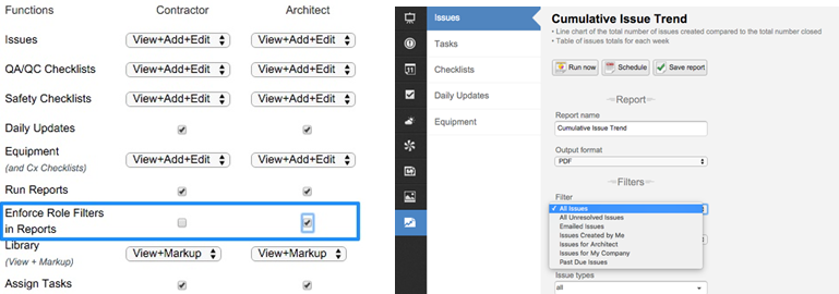 通过针对问题、核对表、设备和任务创建角色过滤器,BIM 360 Field 项目管理员可以限制数据对不同用户的可见性。很快就可以使用相同的过滤器来限制报告中数据的可见性。