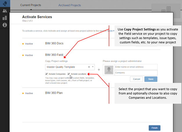 使用此新版本,帐户管理员在 HQ(企业管理)中创建新项目时能够复制 Field 项目设置。这样可简化将自定义字段、问题类型和其他项目设置复制到新项目的流程。在新项目中激活 Field 时,可以选择现有项目以从中复制设置。也可以选择将公司或位置复制到新项目。