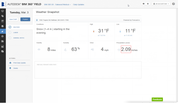 像以前一样,每个用户只能查看自己的每日更新,但可以使用“打印每日更新”功能来共享更新。我们此次暂不支持分包商的每日更新访问权限。