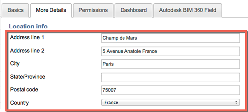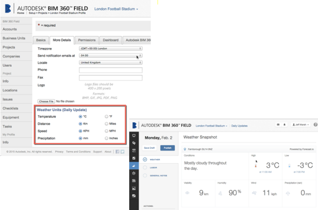 对于项目管理员在项目设置(更多详细信息选项卡)中输入项目位置的项目,将使用位置信息字段中输入的所有可用信息来检索天气。尤其会检查以下位置字段:地址行 1、地址行 2、城市、省/市/自治区、邮政编码和国家/地区。系统以前仅会查看邮政编码字段来收集天气信息。这样可以提供更加精确的气象站检索,从而获得更加准确的天气数据。