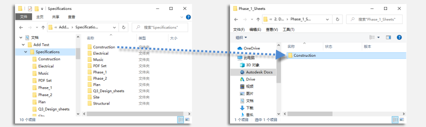 将步骤 2 中的文件夹拖放到步骤 4 中的目标位置,即可将文件上载到 BIM 360。