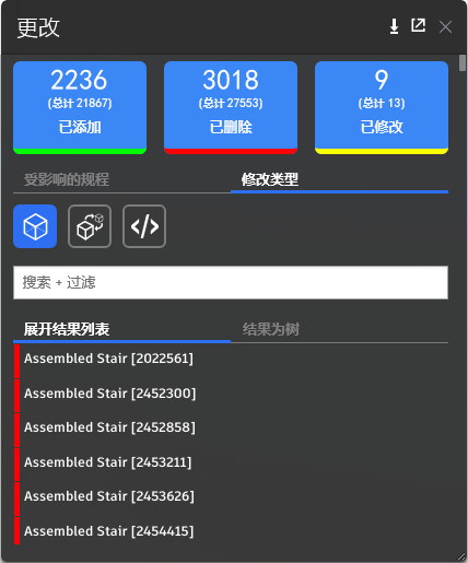 从“已添加”、“已删除”或“已修改”中选择一个选项以显示模型版本中的这些结果。