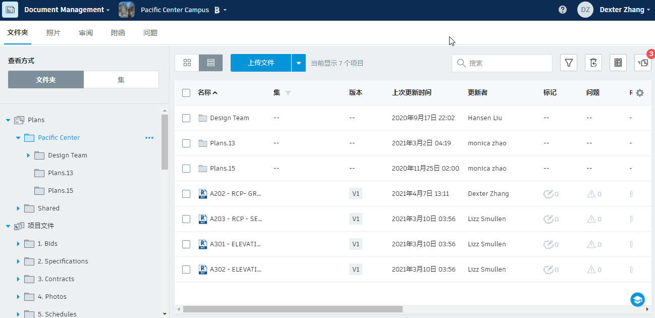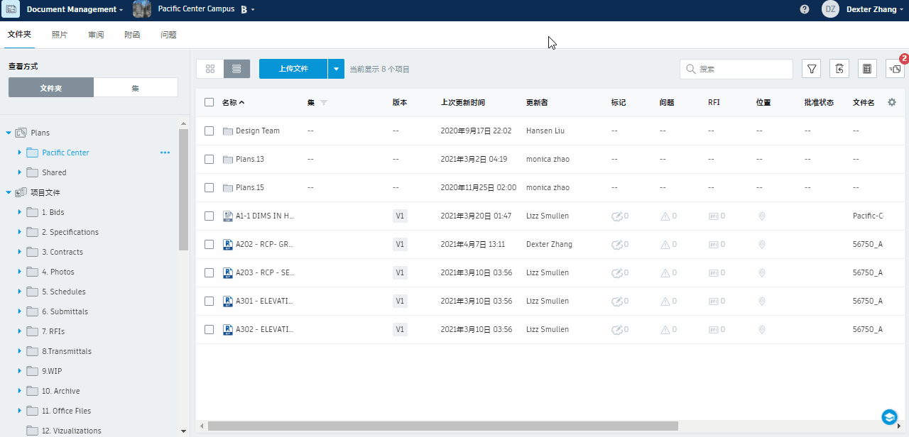 在“文件夹”选项卡中,单击“上传文件”以将文档上传到选定的文件夹。