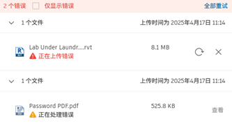 如果将文件上传到“项目文件”,这些文件将经历一个分为两个阶段的过程,以检查文件是否可以上传,以及上传后是否可以查看。文件可能会显示以下错误: