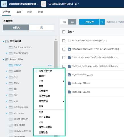每个项目在开始时都会有预配置的顶层文件夹,用来支持特定的操作或数据类型。这些文件夹称为“平面图”和“项目文件”。最多可以向这些文件夹添加最多 25 个子文件夹级别的子文件夹。