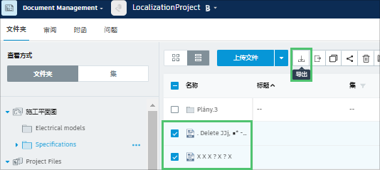 在“平面图”文件夹中工作时,您可以导出单页或多页 PDF 文件,包括任何已发布的标记和超链接。在“项目文件”文件夹中,导出中可能仅包含文档上的标记。