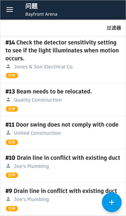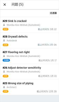 若要按类型、子类型、状态、位置、子位置、被分配者、根本原因或截止日期过滤问题,请点击“过滤器”。