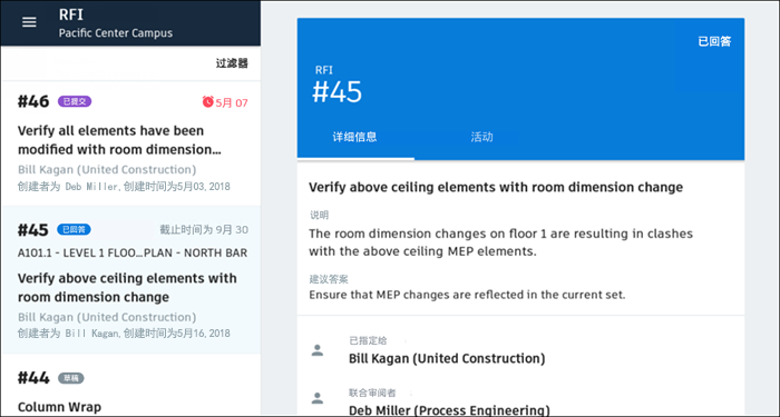 查看 RFI 的状态和活动,然后在项目级和文档级下添加注释和照片。
