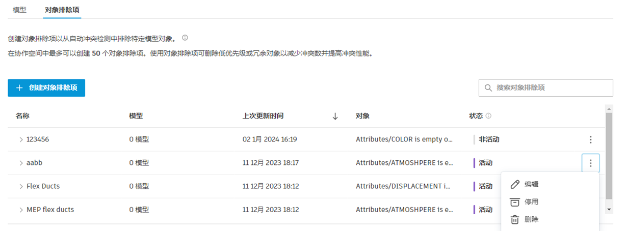 在“对象排除”选项卡中,您可以从自动冲突检测中排除特定的模型对象。