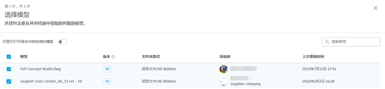 单击导入的对象排除以打开“第 1 步(共 3 步): 选择模型”,然后选择要应用于该对象排除的模型(在上面的“创建对象排除”部分进行了详细说明)。添加模型并完成相关步骤后,再次运行冲突检查以将其应用于协调空间。
