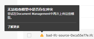在“模型”和“冲突”页面中,特定模型的名称旁边将标有黄色警告图标。这些模型不显示任何冲突数据,因为针对冲突检查处理这些模型时出现了问题。