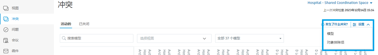 单击协调空间下拉列表,然后选择要为其指定冲突设置的协调空间。此时将在“模型”选项卡中显示该协调空间的相关模型,以及为该特定协调空间创建的对象排除。