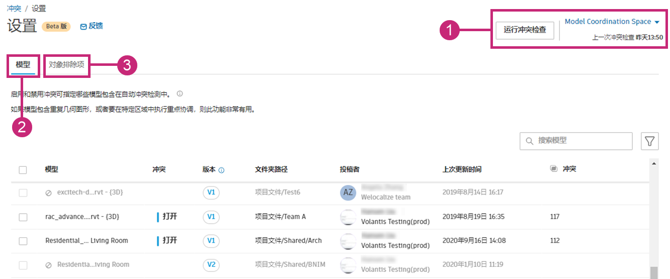 冲突设置页眉包含“运行冲突检查”按钮和协调空间下拉列表,当您在“模型”或“对象排除”选项卡中时,可以访问该下拉列表: