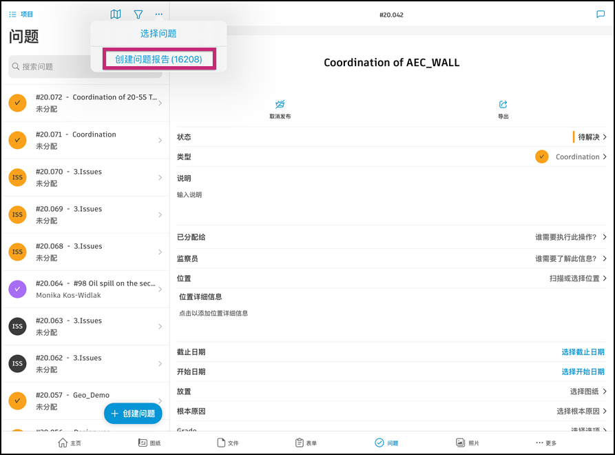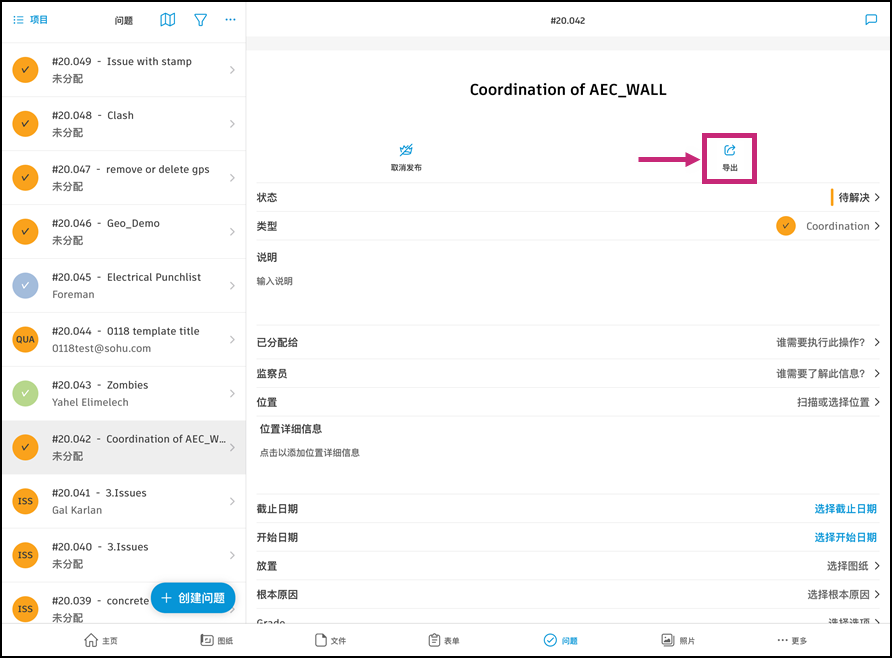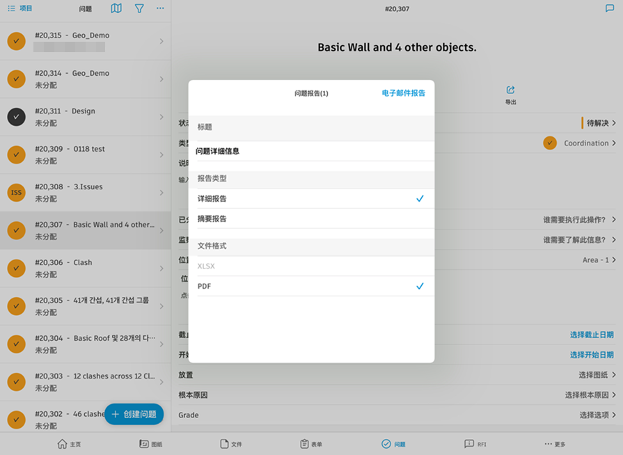在 Forma 移动应用程序的“问题”工具中,您可以生成问题报告并通过电子邮件将其发送给自己。