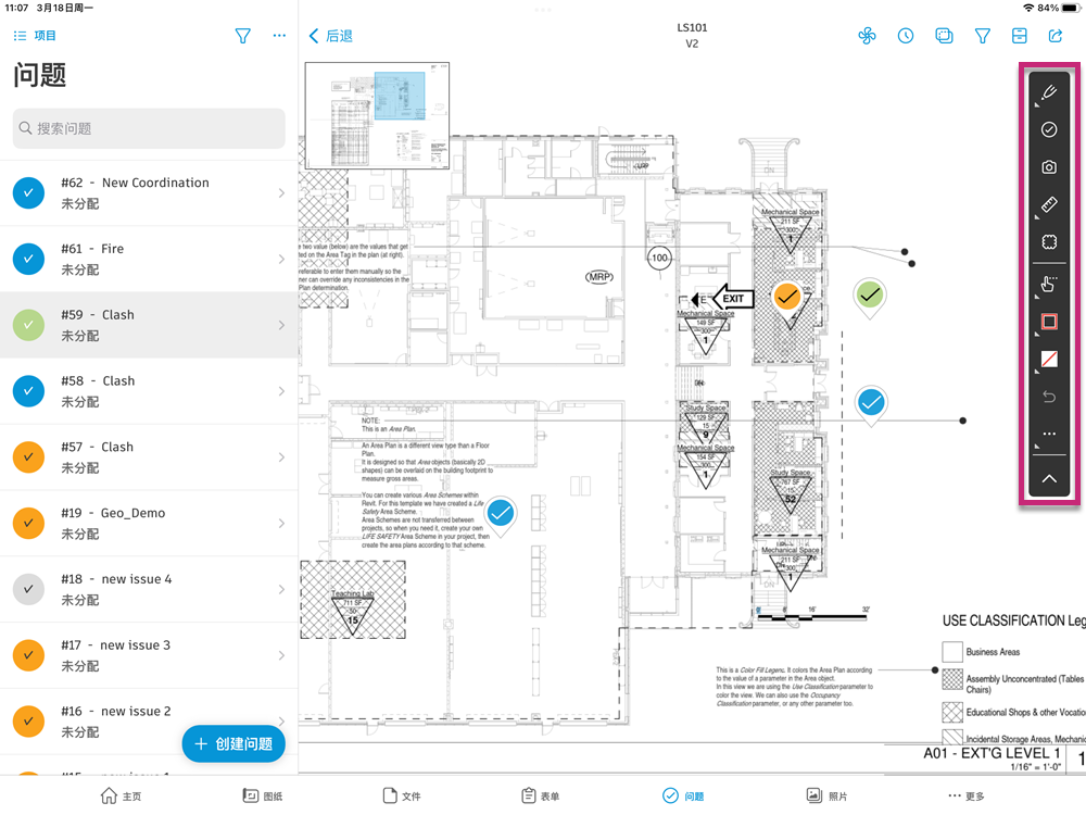通过在适用于 iOS 的新查看器中处理三维模型上的问题,您可以直接在项目的三维环境中直观地放置、查看和管理问题。此功能可帮助团队在上下文中识别并解决设计或施工问题,从而提高协作和准确性。您可以在模型上查看问题图钉、访问问题详细信息,以及使用专用工具进行导航、测量和标记。