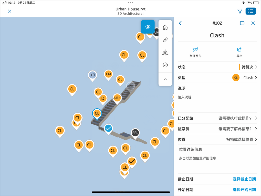 点击所需的问题图钉以打开其详细信息面板,您可以在其中对模型中的问题执行查看、编辑、添加注释、导出、删除、发布或取消发布操作。