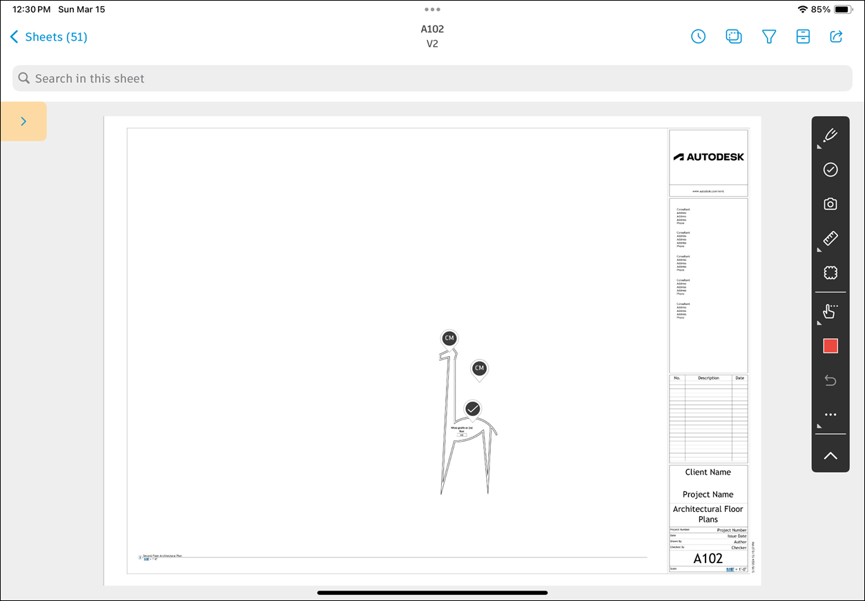 (在放置在图纸上的问题上可用)以查看图纸的修订历史记录和详细信息,并将图纸添加到收藏夹。