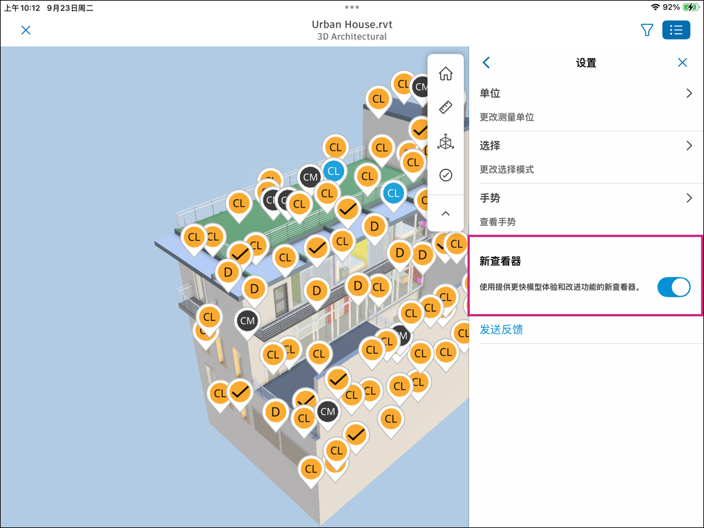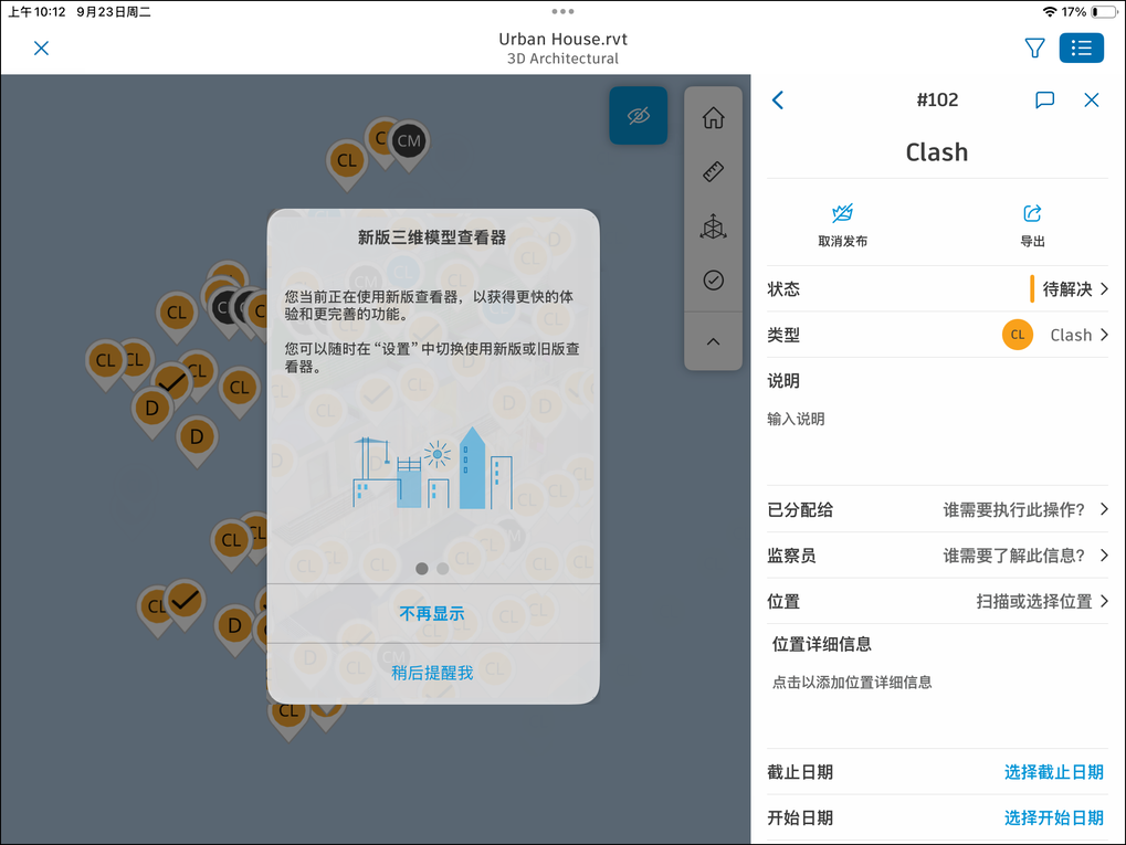 您将能够在新查看器中查看放置在三维模型上的问题。